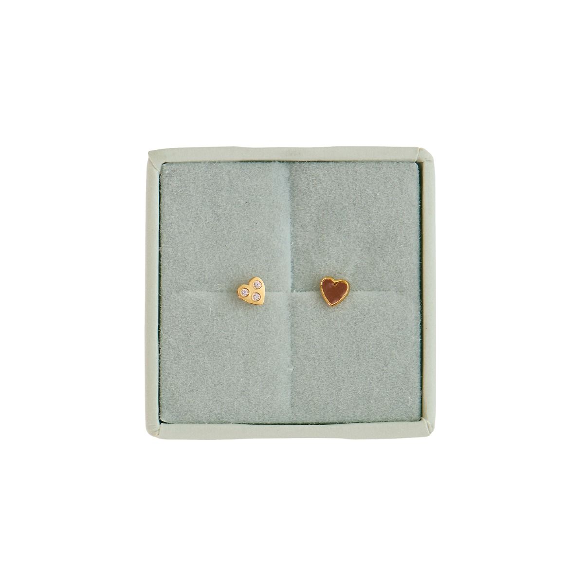 En lille kærlighedsæske med to fine, forgyldte øreringe. Den ene er vores populære Petit Love Heart med lækker, mocha-brun emalje og den anden er en klassisk hjerte-ørestik med tre ædelsten. To skønne darlings der komblimenterer hinanden på smukkeste vis. Bær øreringene som et assymetrisk par, eller tilføje behind-ear vedhæng eller andre STINE A øreringe for et personligt mix.